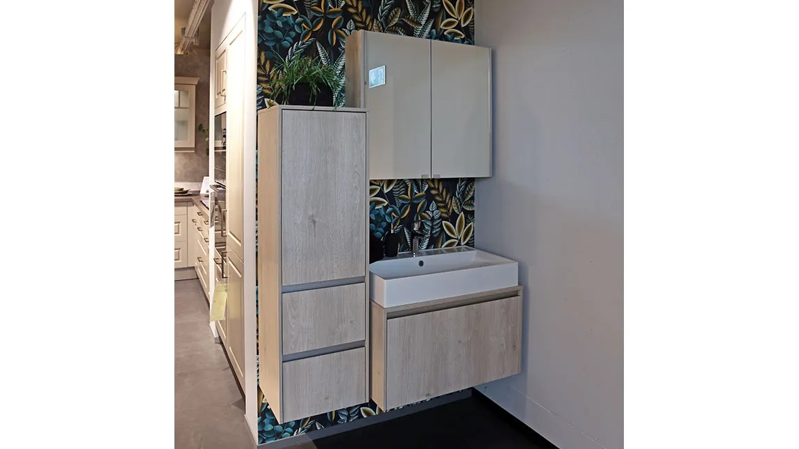 Naturum Lacklaminat, Eiche Montreal Nachbildung - Preis für Möbel inkl. Waschbecken, Armatur und Spiegel. |